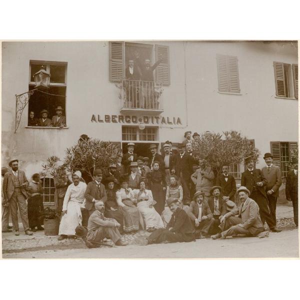 A VERRES. VERRES, GRUPPO DI ESCURSIONISTI IN POSA DAVANTI ALL'ALBERGO D'ITALIA