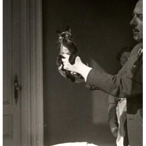 TORINO?, UOMO CHE SORREGGE UN GATTO SIAMESE CON UNA DONNA CHE OSSERVA LA SCENA IN SECONDO PIANO