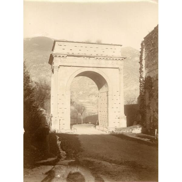 SUSA, LE TERME GRAZIANE (DUE PORTE), PROSPETTO MERIDIONALE CON UN GRUPPO DI STUDENTI IN POSA E L'ARCO DI AUGUSTO SULLO SFONDO