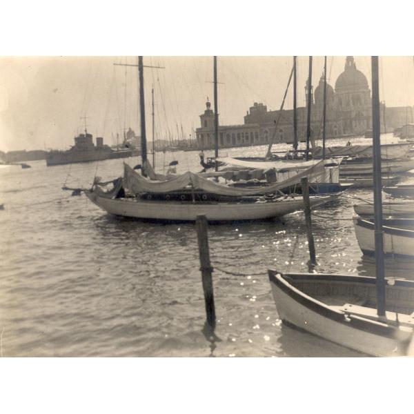 VENEZIA, BARCHE ORMEGGIATE DI FRONTE ALLA PUNTA DELLA DOGANA CON LA CHIESA DI SANTA MARIA DELLA SALUTE SULLO SFONDO