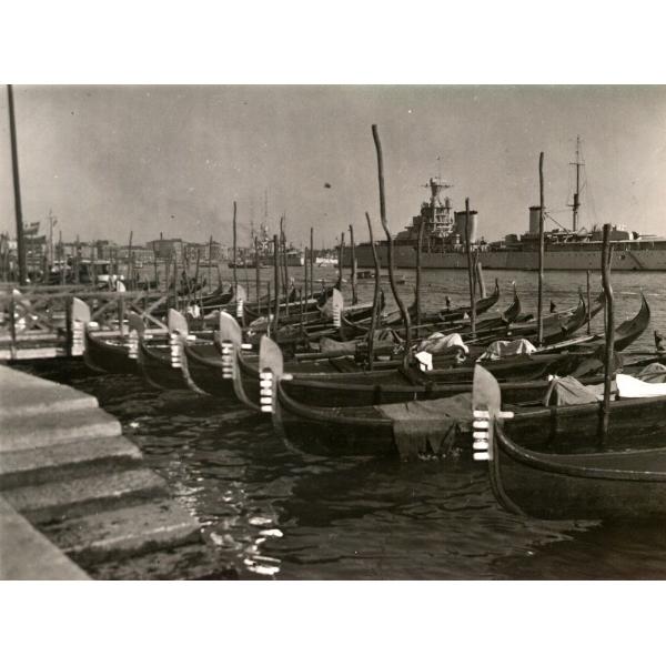 VENEZIA, GONDOLE ORMEGGIATE CON UNA NAVE DA GUERRA IN SECONDO PIANO