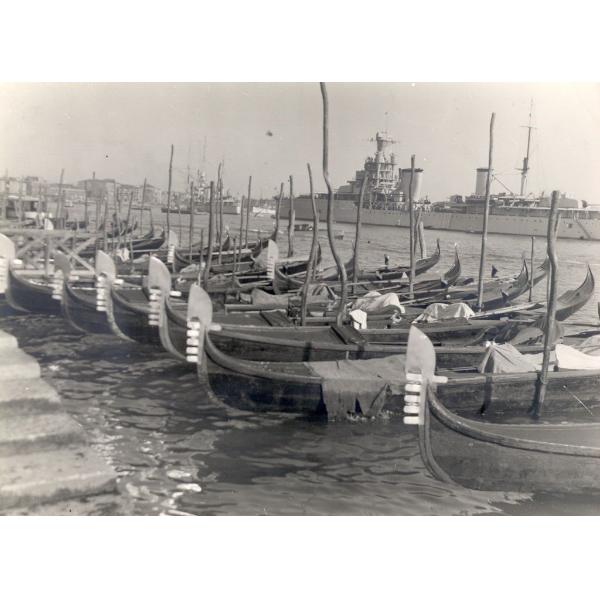 VENEZIA, GONDOLE ORMEGGIATE CON UNA NAVE DA GUERRA IN SECONDO PIANO