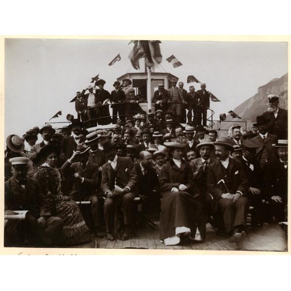 SUL BATTELLO PRESSO RIVE. LAGO DI GARDA, GRUPPO DI ESCURSIONISTI SUL BATTELLO DURANTE LA NAVIGAZIONE