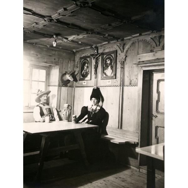 VAL GARDENA, PLAN, COPPIA IN COSTUME SEDUTA A TAVOLA
