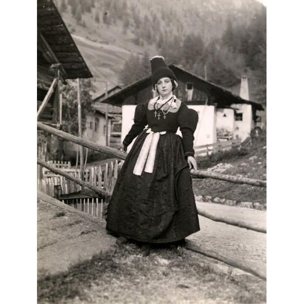 VAL GARDENA, PLAN, DONNA IN COSTUME SEDUTA SU DI UNA STACCIONATA DAVANTI AD UNA BAITA