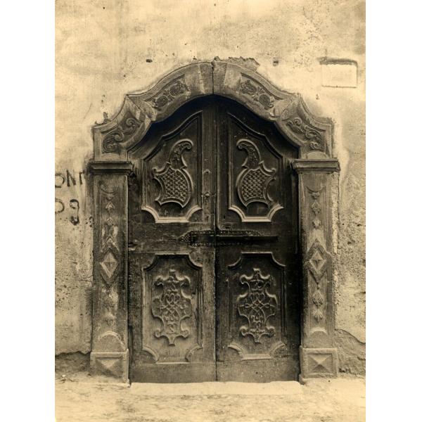 LOCALITA' NON IDENTIFICATA/ PORTALE CON CORNICE MISTILINEA SCOLPITA E PORTONE IN LEGNO A QUATTRO PANNELLI SCOLPITI