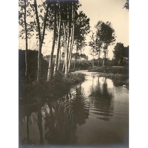 LOCALITA' NON IDENTIFICATA (MONCALIERI?), PAESAGGIO FLUVIALE CON ALBERI RIFLESSI NELL'ACQUA