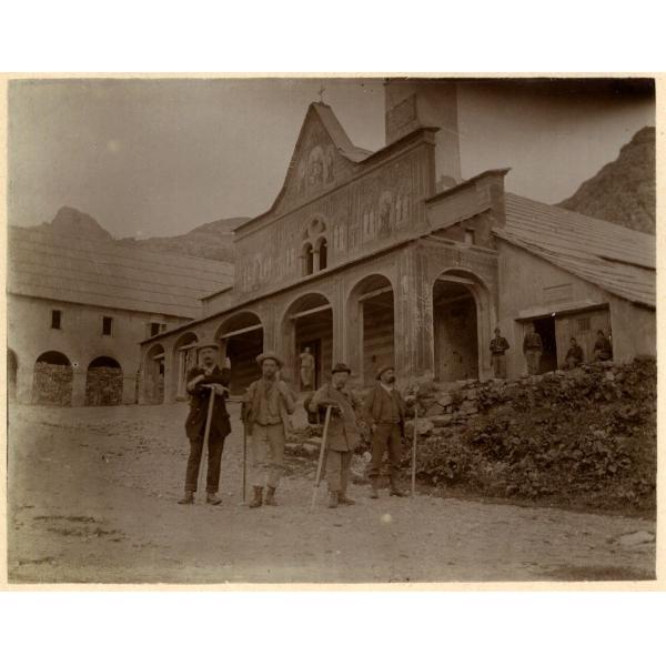 S.ANNA DI VINADIO. VALLE STURA DI DEMONTE, ESCURSIONISTI IN POSA DAVANTI ALLA CHESA DEL SANTUARIO DI SANT'ANNA DI VINADIO