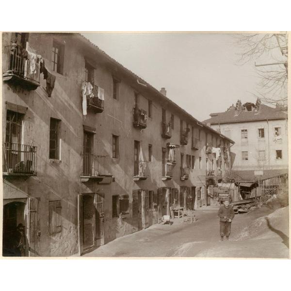 BORGO DEL RUBATTO - CASE PRESSO IL PONTE IN FERRO. TORINO/ BORGO RUBATTO, GRUPPO DI CASE CON UN MAGAZZENO DI LEGNA E CARBONE