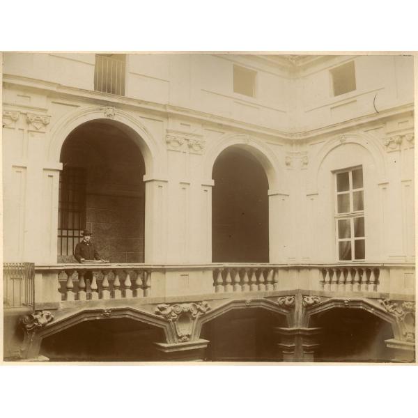 NEL CORTILE DELLA CASA DI VIA GENOVA/ 24 - IL PRIMO PIANO. TORINO/ PALAZZO GIBELLINI, VIA SAN FRANCESCO D'ASSISI, 24, VEDUTA DEL CORTILE, PARTICOLARE DEL SECONDO ORDINE CON PORTICO A COLONNE BINATE ED ARCHI POLIGONALI. UN RAGAZZO OSSERVA IL FOTOGRAFO