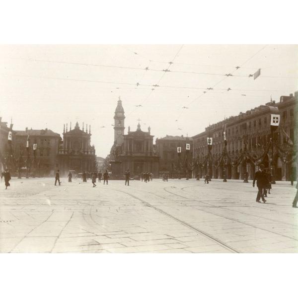 TORINO/ PIAZZA SAN CARLO, VEDUTA VERSO SUD COL MONUMENTO AD EMANUELE FILIBERTO, LE CHIESE DI SANTA CRISTINA E SAN CARLO, CON LAMPIONI ADDOBBATI CON FESTONI E BANDIERE