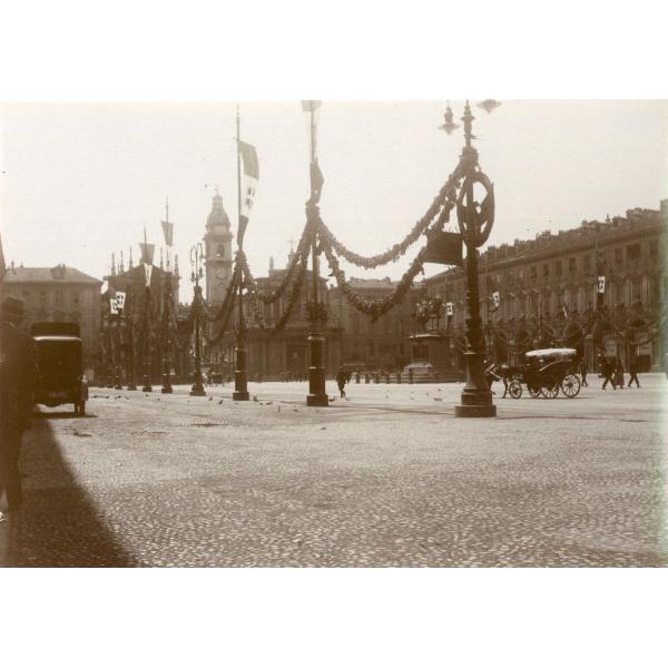 TORINO/ PIAZZA SAN CARLO, VEDUTA VERSO SUD-OVEST COL MONUMENTO AD EMANUELE FILIBERTO, LE CHIESE DI SANTA CRISSTINA E SAN CARLO, IN PRIMO PIANO LAMPIONI ADDOBBATI CON FESTONI E BANDIERE