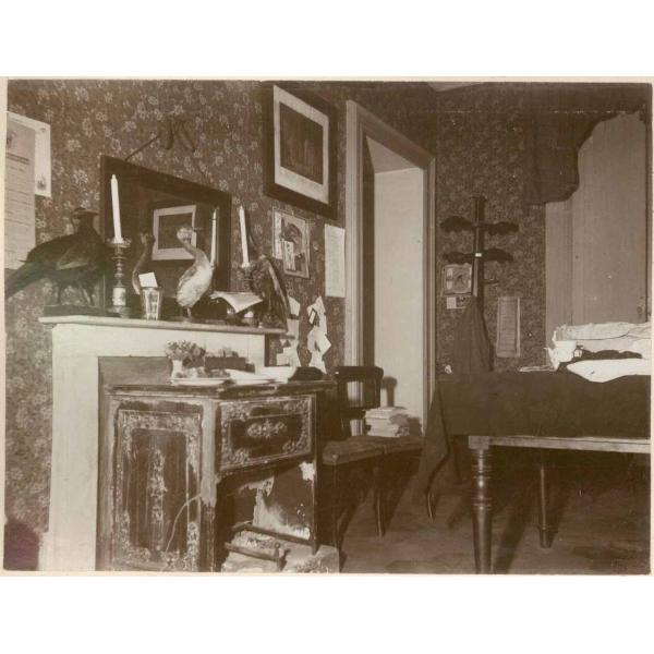 A LUCE DI MAGNESIO (FILO POSE DI 2', E 1'TORINO?, INTERNO DI CASA GABINIO? RIPRESO AL LAMPO DI MAGNESIO CON UN TAVOLO, QUADRI E FOTOGRAFIE ALLE PARETI ED UCCELLI IMPAGLIATI SULLA MENSOLA DEL CAMINO