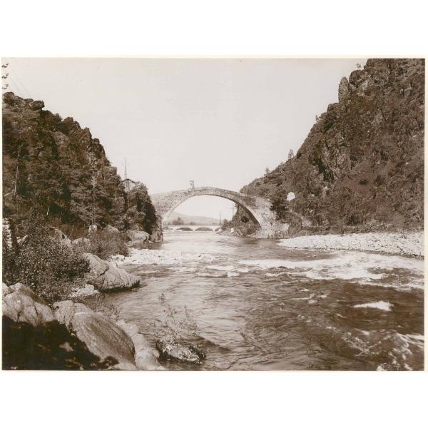 VALLI DI LANZO, LANZO, PONTE DEL ROC DETTO DEL DIAVOLO, VISTA GENERALE DALLA SPONDA DESTRA A MONTE. SULLO SFONDO IL PONTE NUOVO