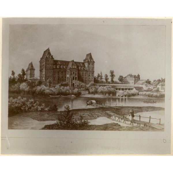 RIPRODUZIONE DI UNA INCISIONE RAFFIGURANTE IL CASTELLO DEL VALENTINO DALLA PARTE DI PO CON LA PASSERELLA IN LEGNO E L'IMBARCADERO
