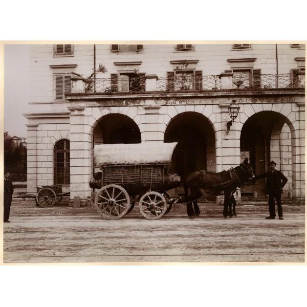 LA BOTALLA DI MONGARDINO. TORINO/ UN CARRO PER IL TRASPORTO DEL VINO DAVANTI ALL'EDIFICIO DEL DAZIO COMUNALE, BARRIERA DI PIACENZA, CORSO MONCALIERI 80