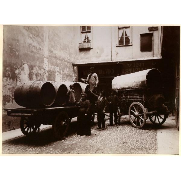 LA BOTALLA DI MONGARDINO. TORINO/ DUE CARRI PER IL TRASPORTO DEL VINO NEL CORTILE DEL MAGAZZINO DA VINO VINI ASTIGIANI