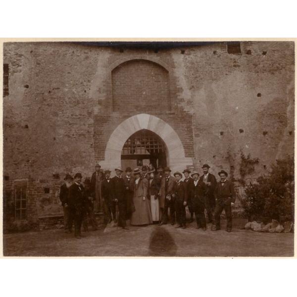A VERZUOLO. VERZUOLO, GRUPPO DI ESCURSIONISTI DAVANTI ALL'INGRESSO DEL CASTELLO