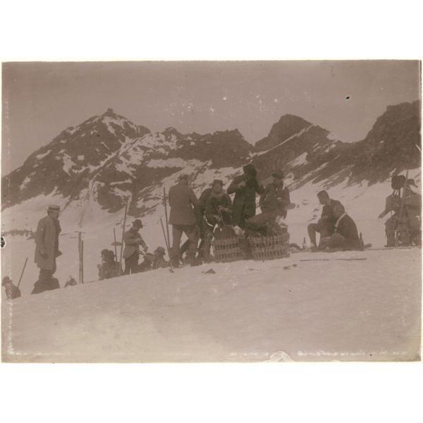 COLAZIONE PRESSO IL COLLE CROCETTA. ALPINISTI DURANTE LA COLAZIONE SUL COLLE CROCETTA