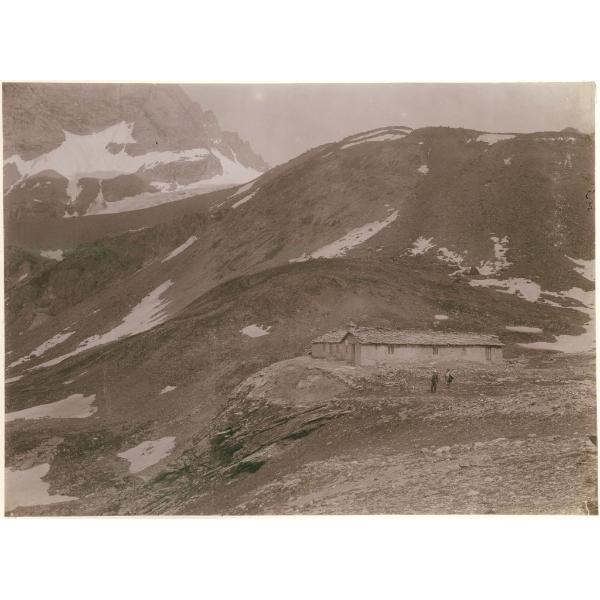 IL CROT DEL CIAUSSINE' (RIFUGIO GASTALDI).VALLI DI LANZO, TRE ESCURSIONISTI PRESSO IL RIFUGIO GASTALDI CON LA BESSANESE SULLO SFONDO