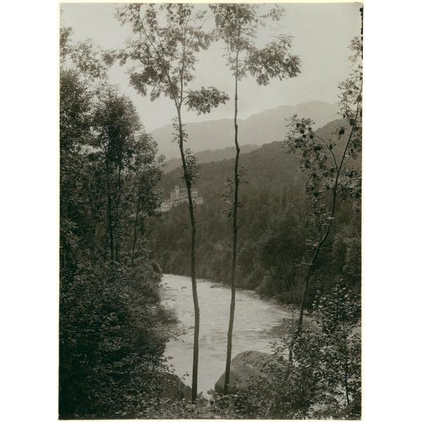 RIVE DELLA STURA PRESSO MEZZENILE. VALLI DI LANZO, PAESAGGIO CON LA STURA E LA CHIESA DI MEZZENILE SULLO SFONDO