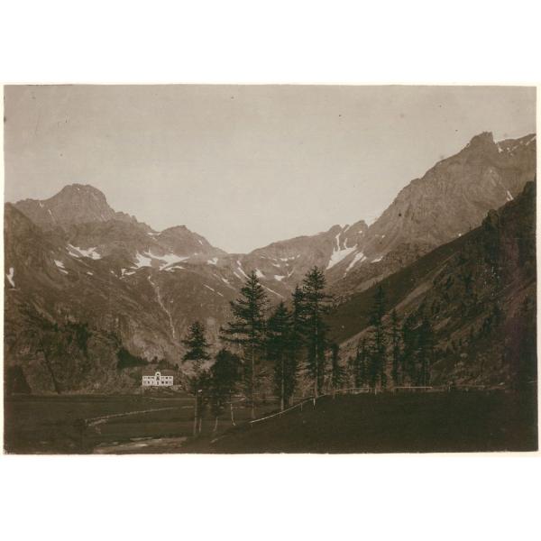 SUL PIANO DELLA MUSSA (M.1800) -. VALLI DI LANZO, PIAN DELLA MUSSA, VEDUTA VERSO OVEST CON LA BESSANESE E LA CIAMARELLA SULLO SFONDO E L'HOTEL BROGGI IN SECONDO PIANO