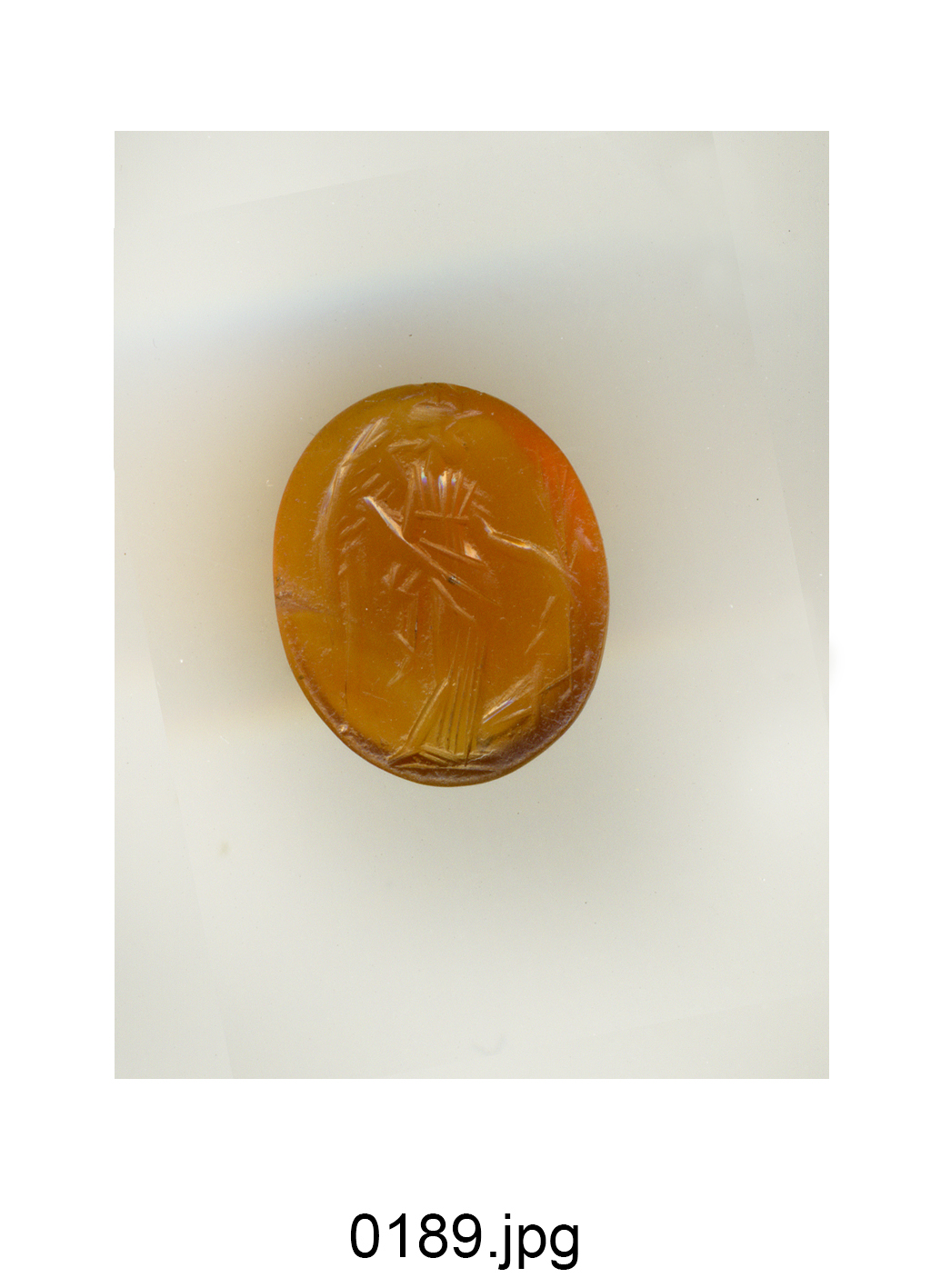 Corniola arancione. Retro piatto. Forma ellittica; Zwierlein-Diehl 11. Fortuna[-Minerva-Cerere-Vittoria] alata stante di profilo verso d., con spighe e timone nella mano s. e cornucopia nella d. Linea di base. Lavoro sommario.