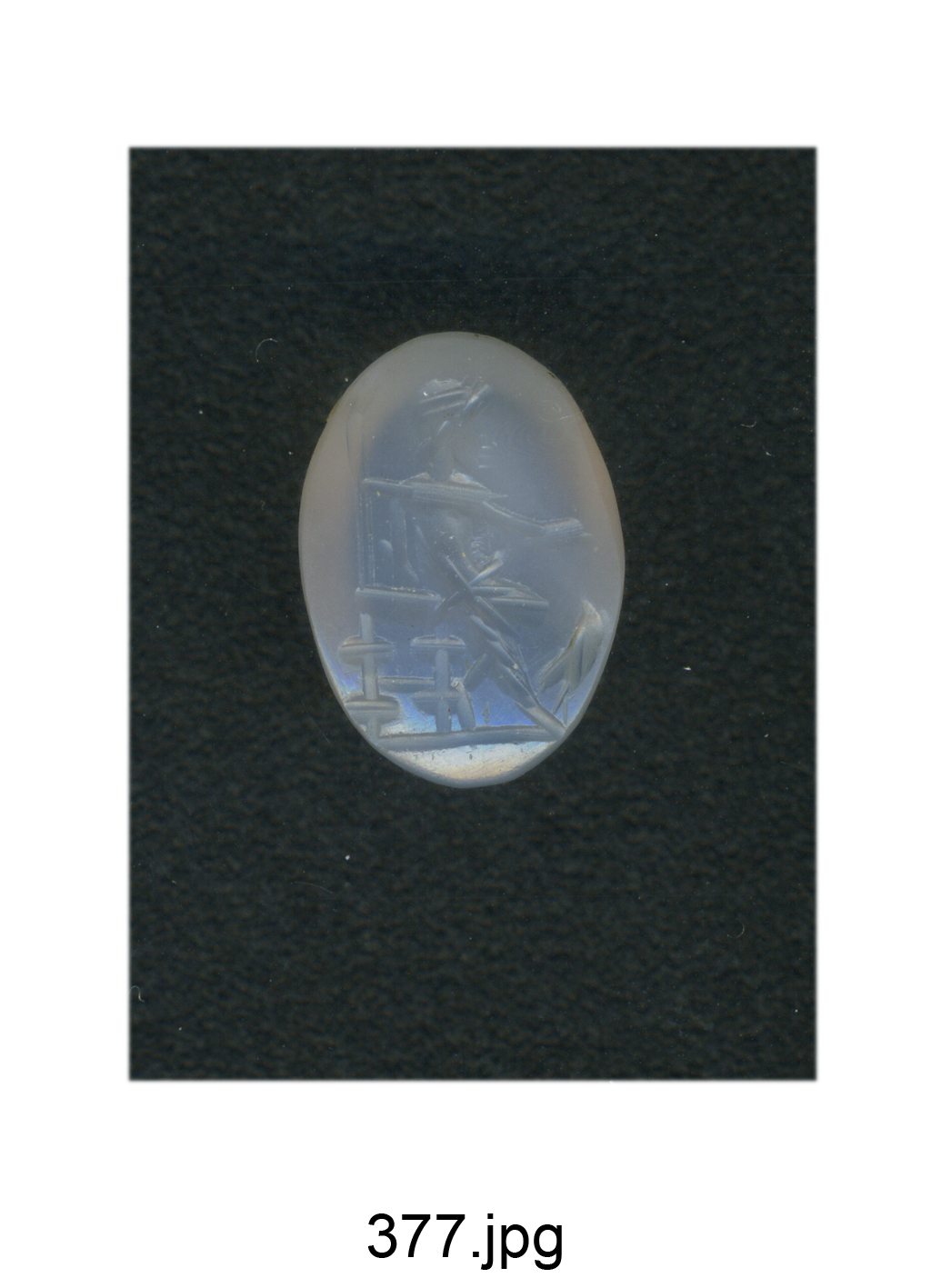 Calcedonio grigio-azzurro traslucido. Forma ellittica; Zwierlein-Diehl 6c. Giove seduto di tre quarti verso d., con la testa di profilo a d., su un trono con schienale e con gambe modanate; con tenia nei capelli e vestito di solo himation che scende dalla spalla d. ed avvolge le gambe, incrociate; con il braccio d. piegato verso l'alto si appoggia ad un corto scettro posato sul piano del sedile; nella mano s. protesa tiene una patera; sulla d., ai suoi piedi, un'aquila di tre quarti verso d., con la testa retrospiciente. Linea di base.