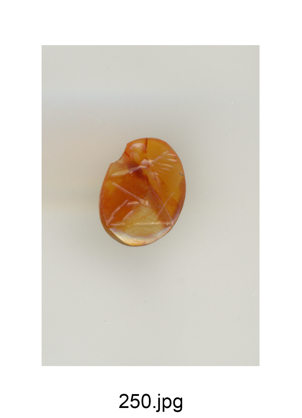 Corniola arancione. Forma ellittica; Zwierlein-Diehl 6. Figura maschile nuda, alata (Erote), inginocchiata (o, meno probabilmente, seduta) di profilo verso s.; il ginocchio s. sembra appoggiato a terra, il d. alzato; il braccio s. è proteso in avanti e sembra reggere una freccia (?) tenuta obliquamente verso il basso; il braccio d. non è visibile; alle spalle è un altro segmento lineare obliquo ritto a terra (freccia o bastone?). Linea di base.