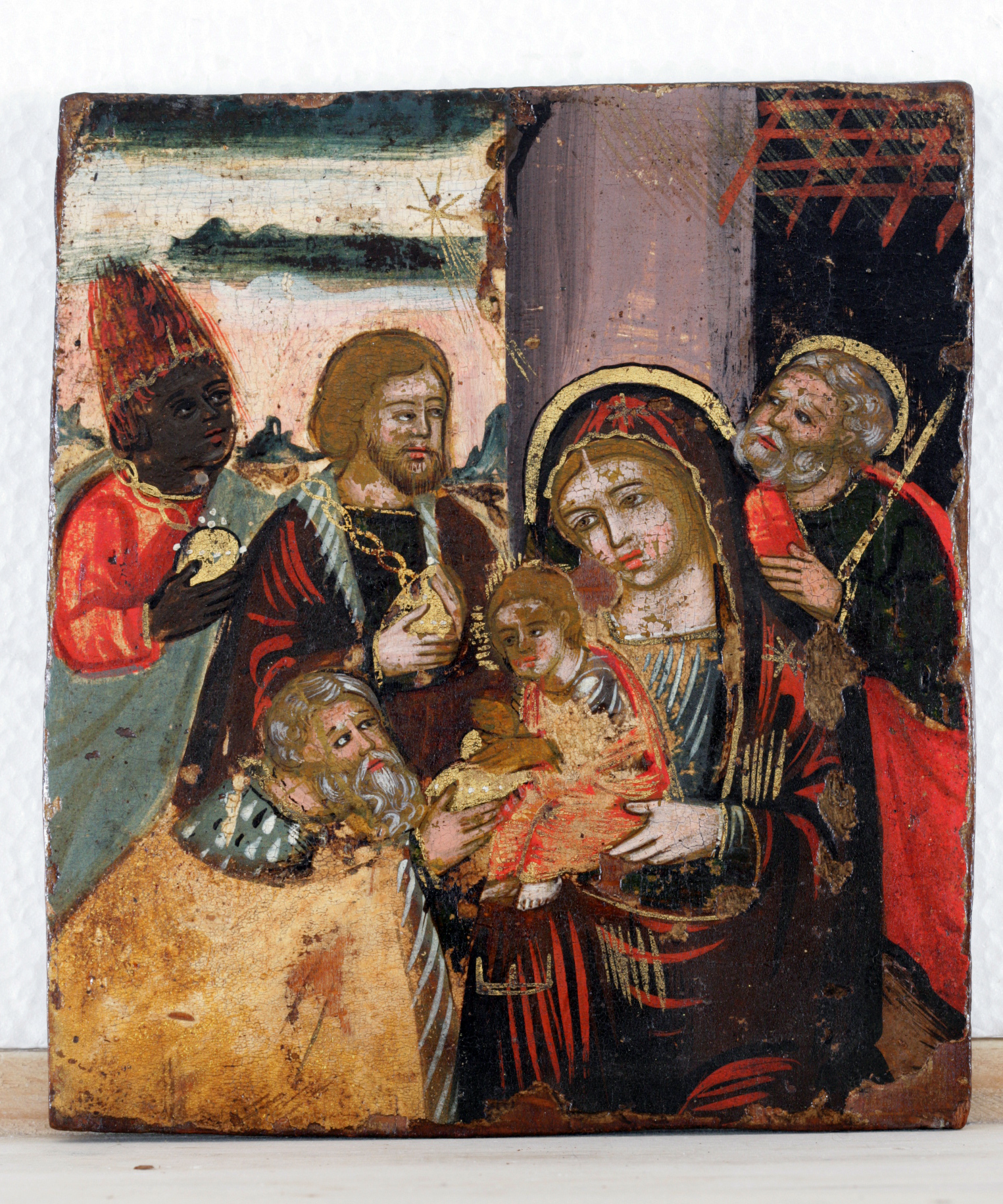 tavola di forma rettangolare. Soggetti sacri: Adorazione dei Re Magi. Personaggi: Madonna; Gesù Bambino; San Giuseppe; i tre Re Magi. Paesaggio rurale