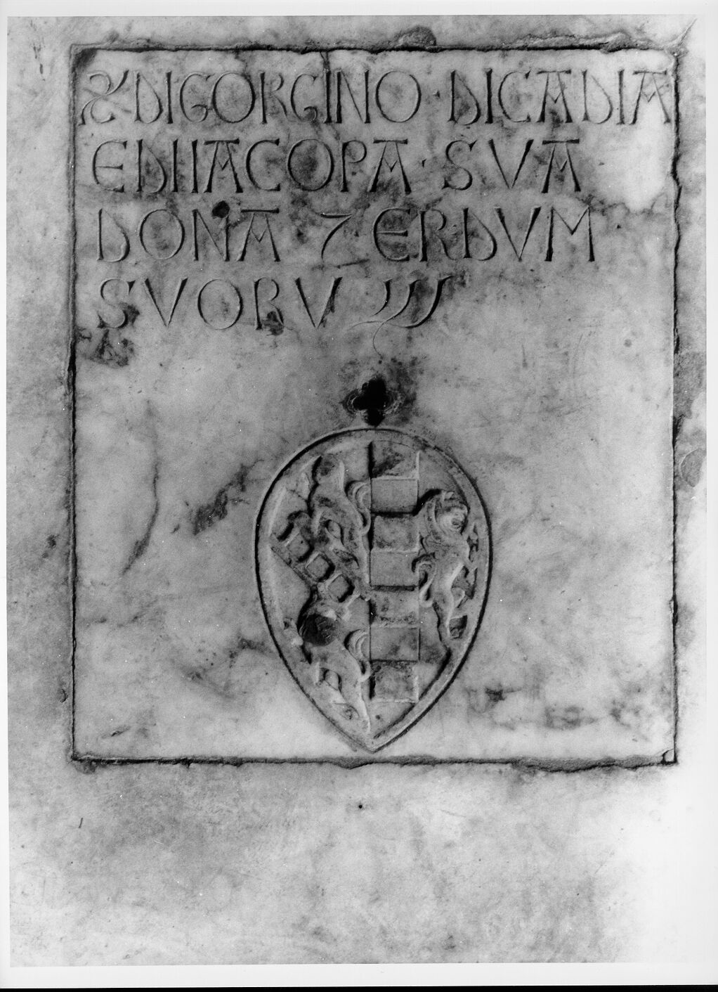 Lapide terragna di Giorgino di Candia e di sua moglie Jacopa; lastra liscia, reca in alto un chiusino con iscrizione e stemma.