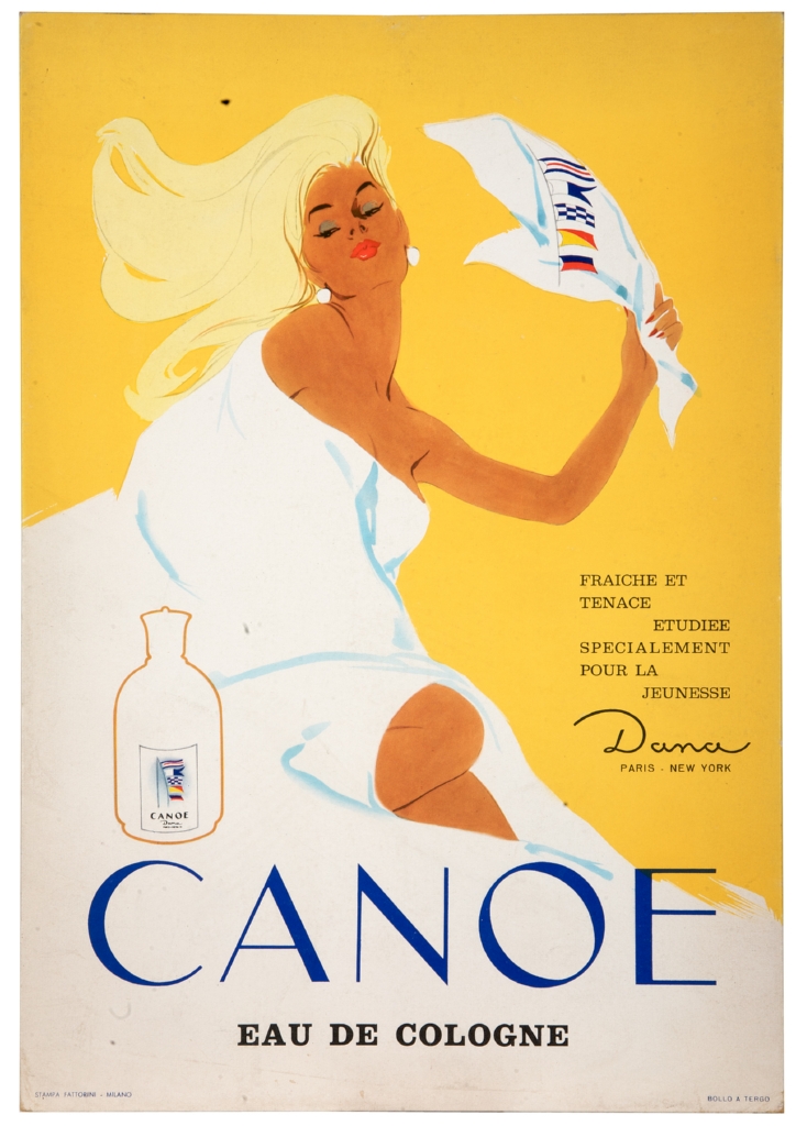 Lettura iconografica: figura femminile; telo bianco con bandiere; bottiglia di acqua di colonia. Categoria merceologica/ tipo evento: industria chimica; profumi; acqua di colonia. Nomi: Canoe eau de cologne; Dana. Luoghi: Parigi; New York; Milano