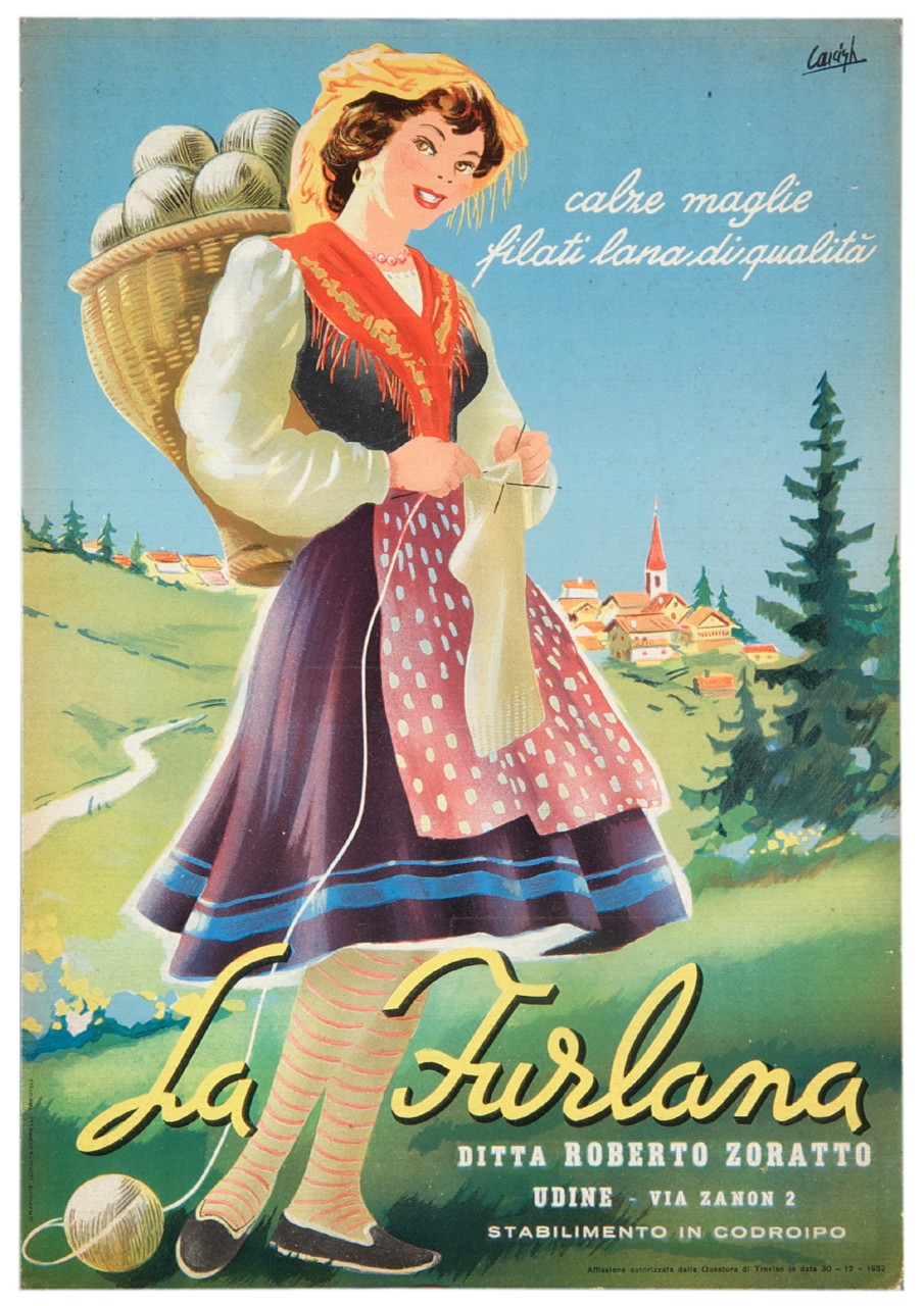 Lettura iconografica: figura femminile; abito folkloristico; foulard; scialle; grembiule; gerla; gomitoli di lana; paesaggio montano; paese; campanile. Categoria merceologica/ tipo evento: industria tessile; filati; filo di lana; abbigliamento; maglieria; calze; maglia. Nomi: La Furlana; Ditta Roberto Zoratto. Luoghi: Udine; Codroipo