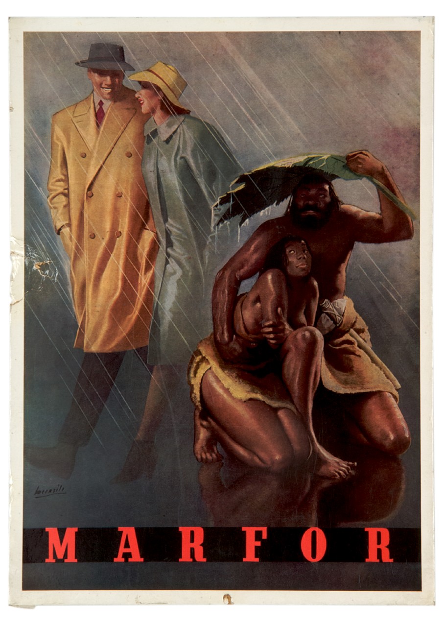 Lettura iconografica: figura maschile; figura femminile; coppia di primitivi; impermeabili; cappelli; pioggia; foglia di banano. Categoria merceologica/ tipo evento: industria tessile; abbigliamento; impermeabile. Nomi: Marfor. Luoghi: Milano