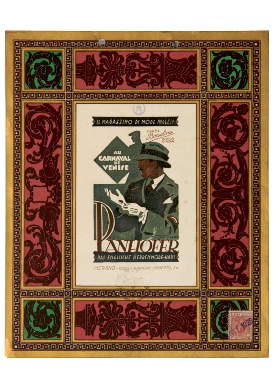 Lettura iconografica: figura maschile; gentiluomo; cappello; guanti. Categoria merceologica/ tipo evento: commercio; negozio di abbigliamento. Nomi: Panhofer das englische Herrenmode- Haus; Panhofer magazzino di mode inglesi; Carnival de Venise; Borsalino. Luoghi: Bolzano; Merano
