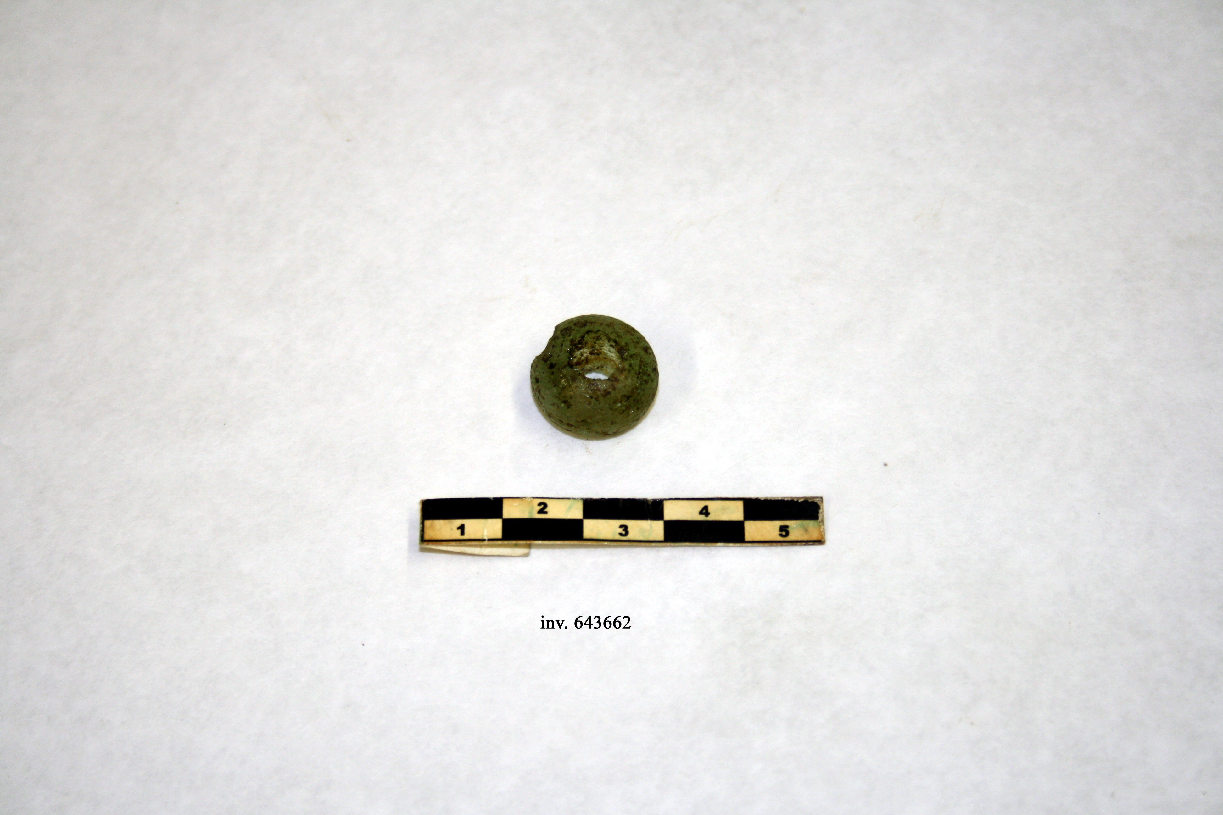 vago di forma globulare schiacciata, con foro passante centrale. Pasta vitrea verde- acqua con vacuoli sulla superficie.
