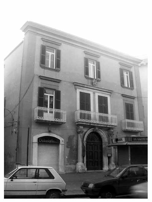strutture verticali: in muratura intonacata, intero bene; elementi decorativi: cornici soprabalcone; cornicione; colonne; portale (pietra; pietra; pietra; pietra), prospetto principale; prospetto principale; prospetto principale; prospetto principale, esterna; esterna; esterna; esterna; isrizioni, lapidi, stemmi: stemma (pietra), prospetto principale, in asse con l'ingresso