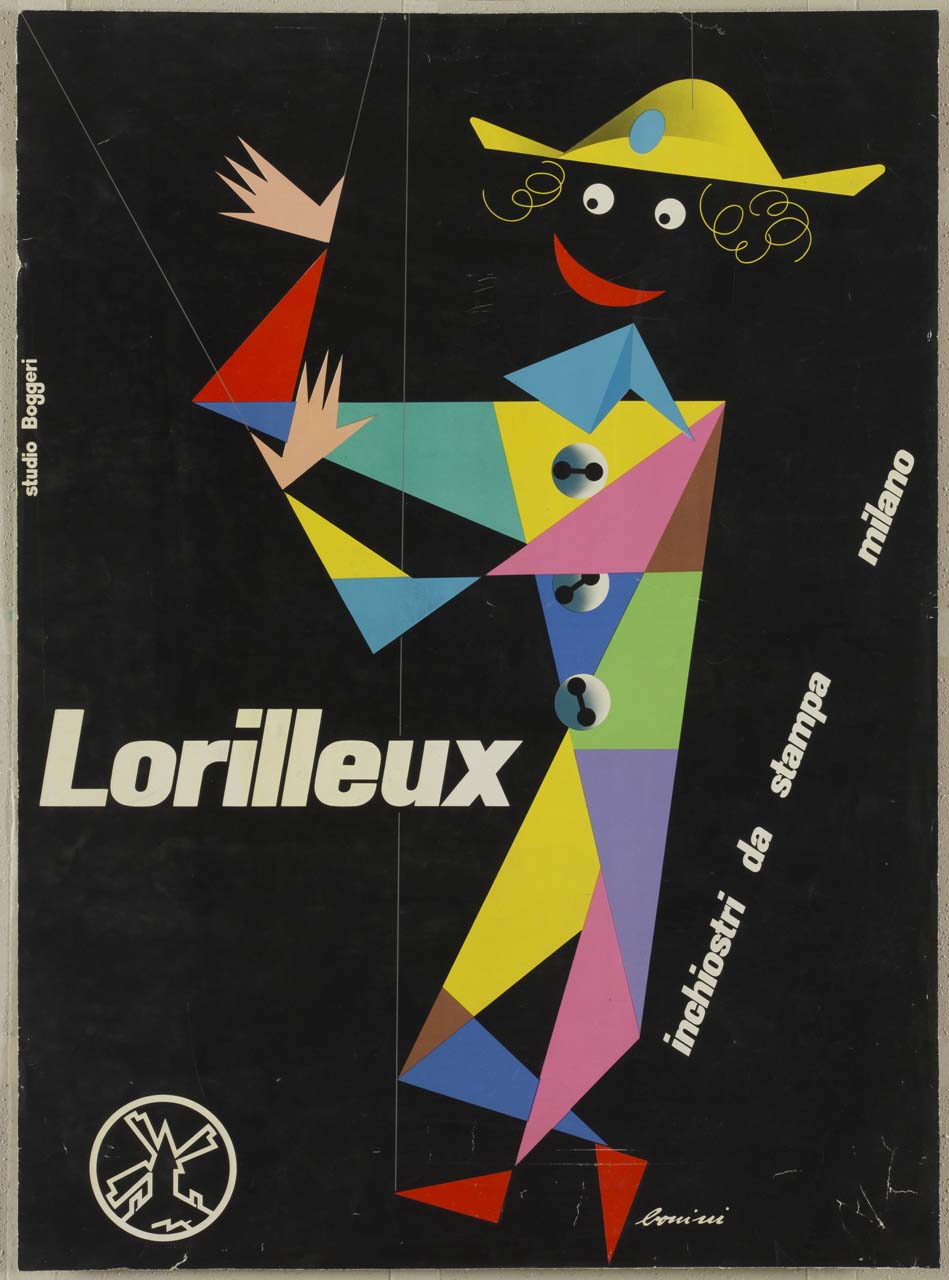 Lettura iconografica: marionetta Arlecchino. Categoria merceologica/ tipo evento: industria chimica; coloranti e pigmenti; inchiostro da stampa. Nomi: Lorilleux. Luoghi: Milano
