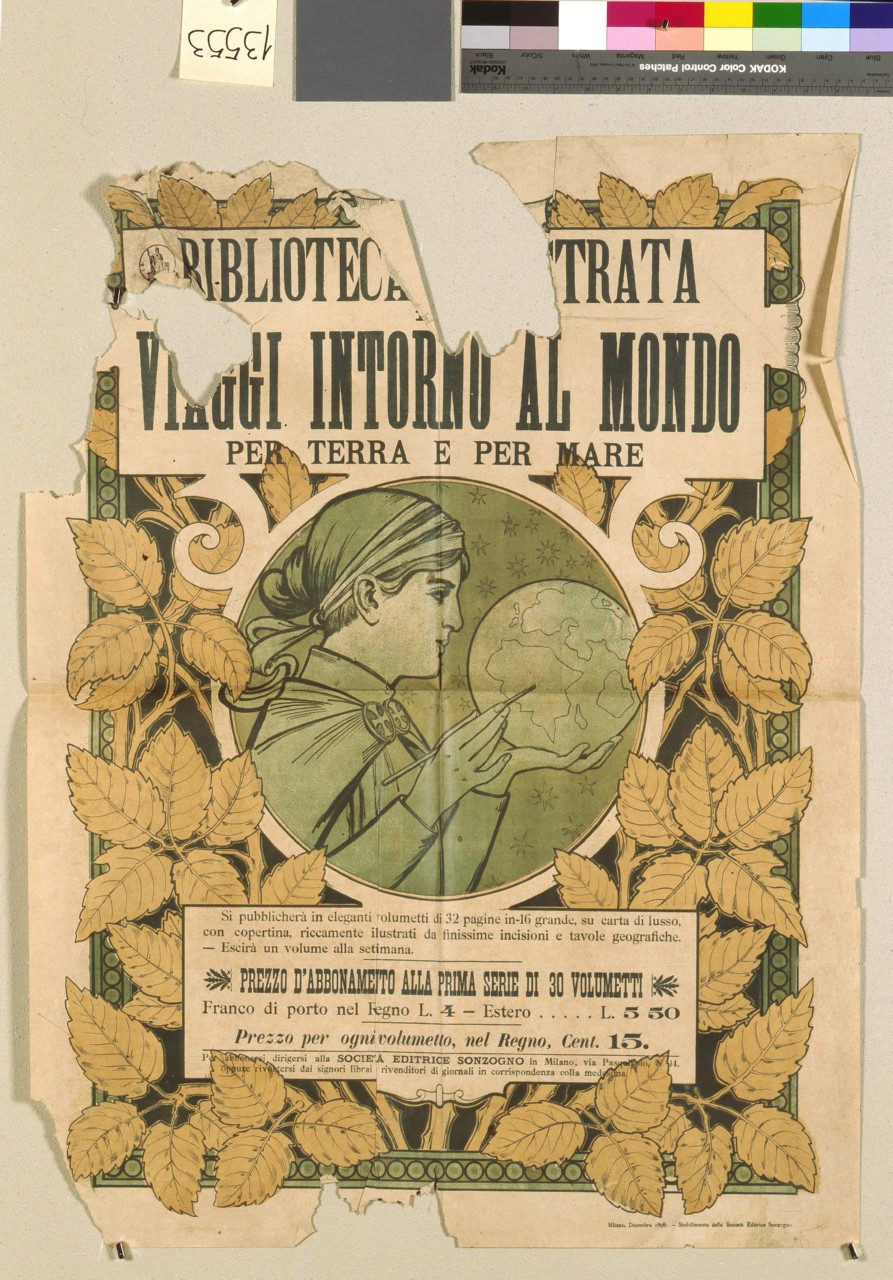Lettura iconografica: fanciulla; pennello; globo terrestre. Categoria merceologica/ tipo evento:informazione e comunicazione; editoria; libro; enciclopedia. Nomi: Biblioteca illustrata viaggi intorno al mondo. Luoghi: Milano
