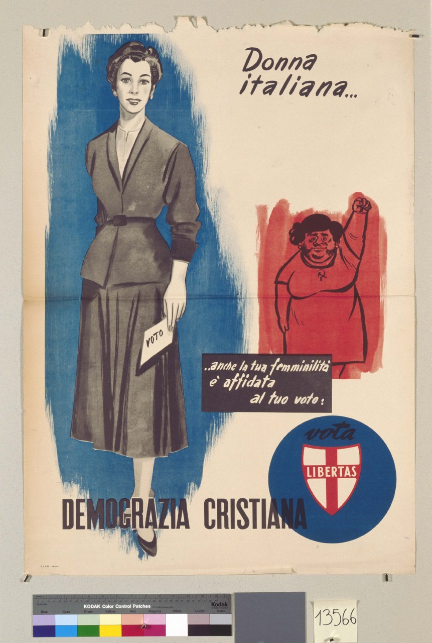 Lettura iconografica: figure femminili; elettrici; scheda elettorale; pugno chiuso. Categoria merceologica/ tipo evento: politica; partiti politici; informazione e comunicazione; propaganda elettorale. Nomi: Democrazia Cristiana