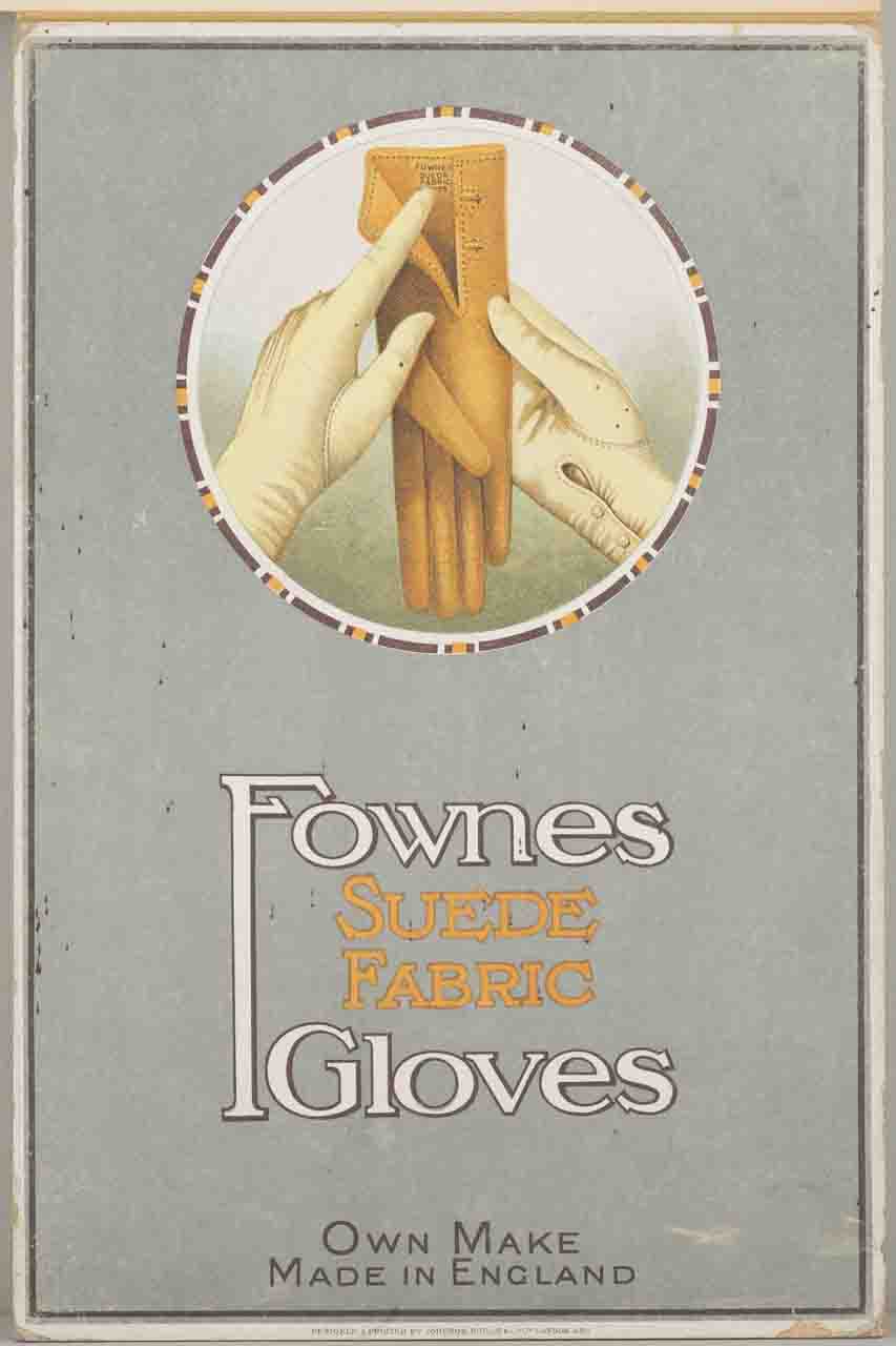due mani guantate sorreggono un guanto indicando la scritta FOWNES SUEDE FABRIC GLOVES (locandina)
