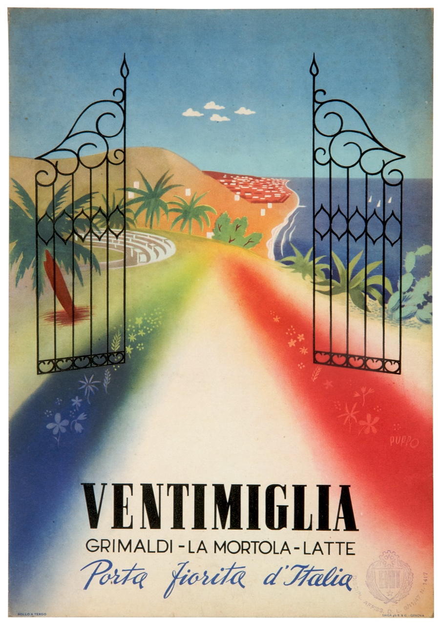 Lettura iconografica: cancello aperto; palme; piante grasse; paesaggio marittimo; città; anfiteatro. Categoria merceologica/ tipo evento: turismo; enti di promozione turistica; mare. Nomi: ENIT; Ente Nazionale per l'incremento delle Industrie Turistiche. Luoghi: Ventimiglia; Imperia; Grimaldi; La Mortola; Latte