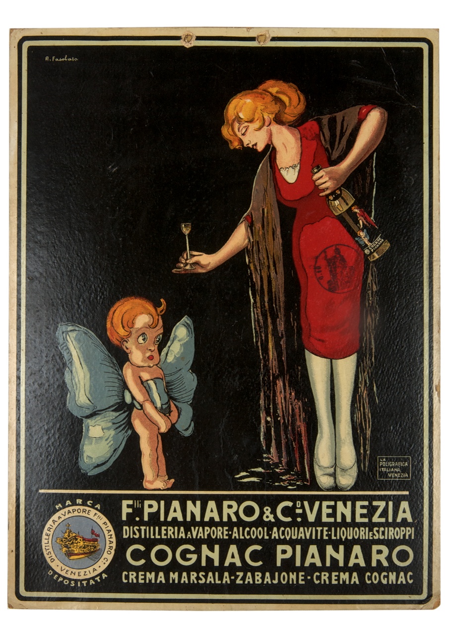 Lettura iconografica: figura femminile; bambino; nudo; bottiglia di liquore; fiocco; bicchiere. Categoria merceologica/ tipo evento: industria alimentare; bevande; liquori. Nomi: Crema Pianaro; Crema Marsala; Zabajone; Crema Cognac; Alcool; Acquavite; Liquori; Sciroppi; Distilleria a vapore F.lli Pianaro C. Luoghi: Venezia