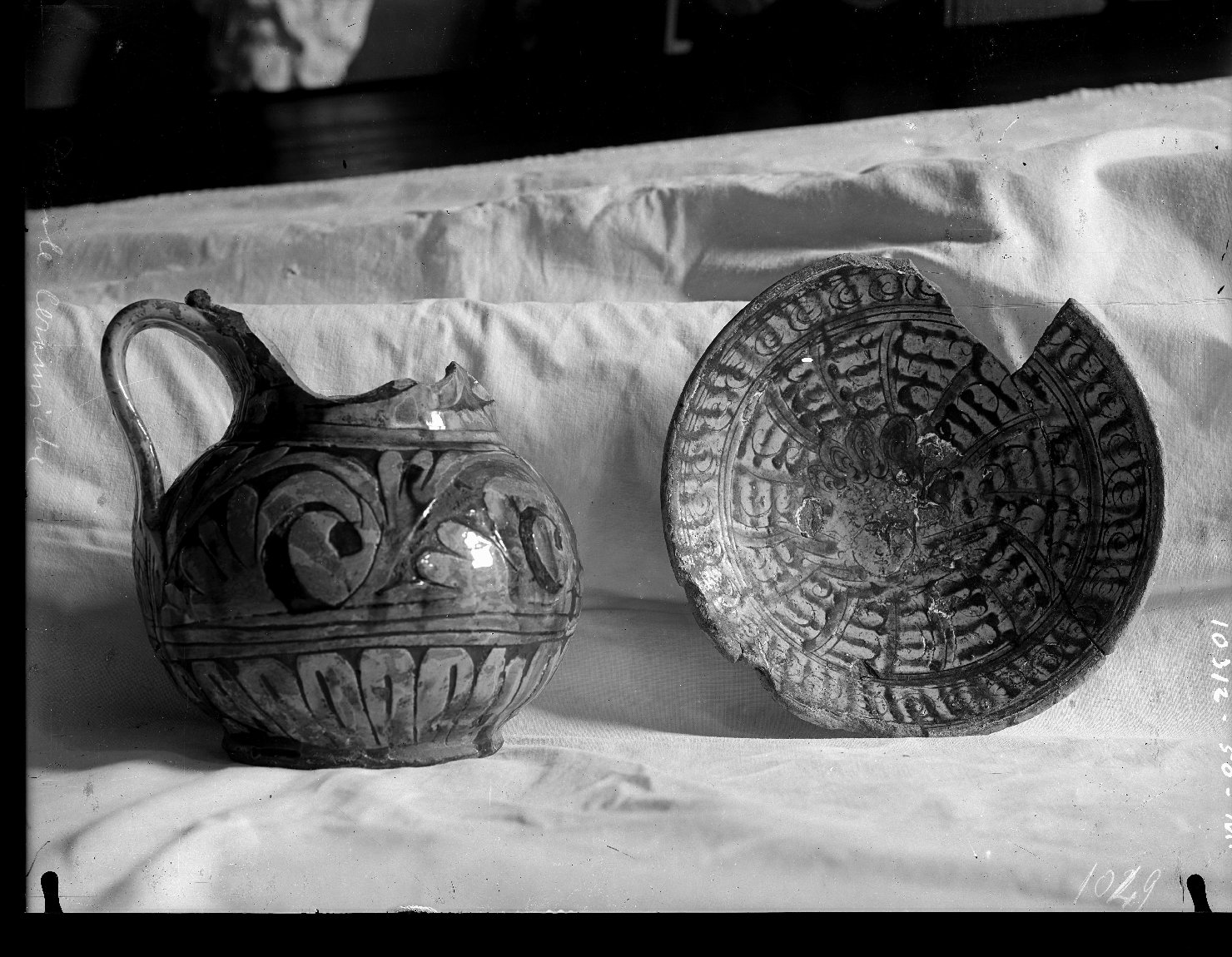 Mantova - Ceramiche - Allestimenti, Mantova - Palazzo Ducale - Collezione di ceramiche - Boccale - Piatto in terracotta ingobbiata graffita e dipinta con testa ricciuta di angelo alato - fine sec. XV - produzione mantovana (attr.)
