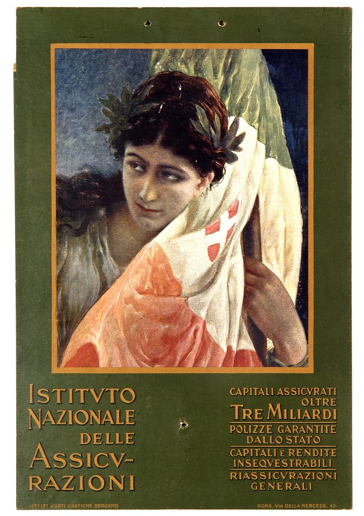 Lettura iconografica: figura femminile; bandiera tricolore; stemma gentilizio; stemma Savoia. Categoria merceologica/ tipo evento: attività finanziarie e assicurative; assicurazioni; compagnia assicurativa. Nomi: INA; Istituto Nazionale delle Assicurazioni. Luoghi: Roma