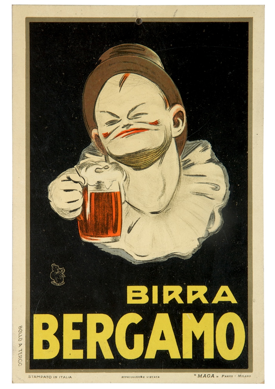 Lettura iconografica: personaggio di fantasia; figura maschile; boccale di birra; cappello. Categoria merceologica/ tipo evento: industria alimentare; bevande; birra. Nomi: Birra Bergamo