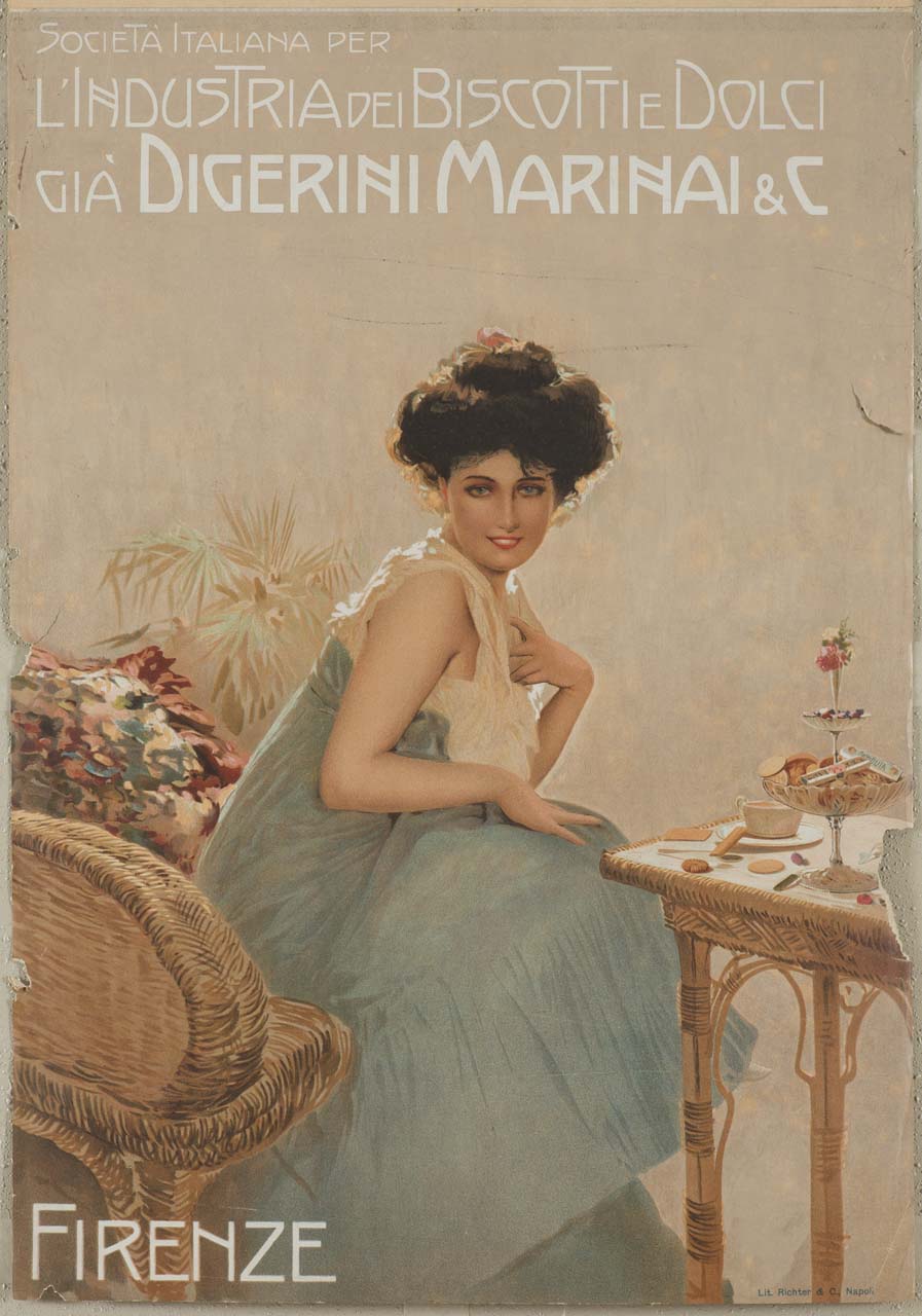 Lettura iconografica: donna; poltrona; tavolino; tazza; dolci. Categoria merceologica/ tipo evento: industria alimentare; prodotti da forno; biscotti; pasticceria; dolci. Nomi: Industria dei Biscotti e Dolci; Digerini Marinai C. Luoghi: Firenze