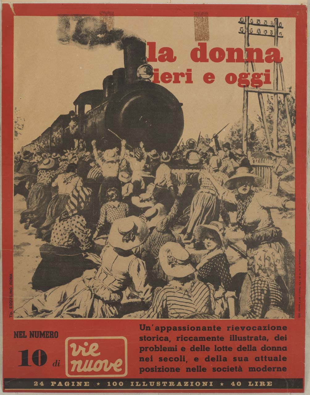 Lettura iconografica: figure femminili; treno; soldati. Categoria merceologica/ tipo evento: informazione e comunicazione; editoria; periodico settimanale; propaganda comunista. Nomi: La donna ieri e oggi; Vie Nuove. Luoghi: Roma