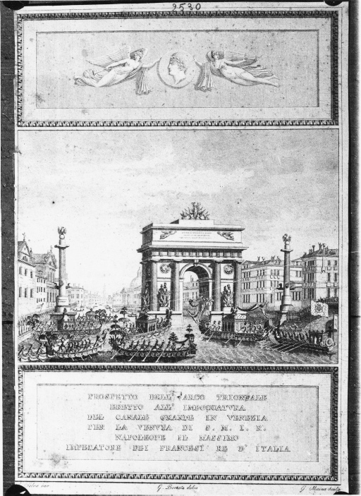 Venezia - scenografia - festa - Napoleone - arco trionfale, Ripresa di una incisione raffigurante una veduta della scenografia eretta a Venezia, Canal Grande, per l'arrivo di Napoleone (1787) in città; la scenografia era costituita da un arco di trionfo progettato dall'architetto Giannantonio Selva; l'incisione è stata realizzata da G. Maina, su disegno di G. Borsato