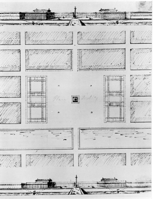 Piazza - progetto, Ripresa da monografia del progetto di una Piazza, opera dell'architetto Clemens Wenzeslaus Coudray; il progetto raffigura pianta e alzato